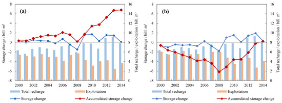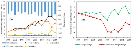 Main groundwater fluxes and storage change under planned rice area (a) and suitable rice area (b). All data of the two models are the same, except for the rice area; (b) is 0.054 million hm2 more than (a). The meteorological data are from 2000 to 2014, so the abscissa still uses this simulation period.