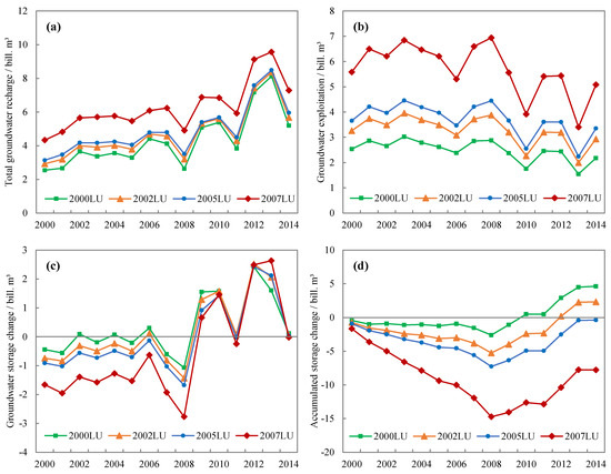 Comparison of main groundwater fluctuations and storage under LU in 2000, 2003, 2005, and 2007. (a) Total groundwater recharge, (b) groundwater exploitation, (c) groundwater storage change, and (d) accumulated storage change.