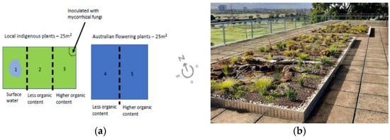 Details of green roof plots on Building M at Victoria University’s Footscray Park Campus: (a) Green roof design, (b) Actual constructed green roof.