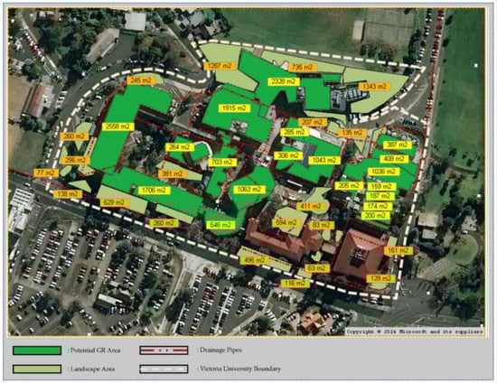 Table 2 provides detailed information about the VU campus’s catchment characteristics. Figure 2 further describes the VU campus’s existing plan by providing information about flat roof area, landscape area, and the existing stormwater drainage system. The VU campus has a total roof area of 22,018 m2; however, only 13,159.5 m2 are available for potential GR installation. The estimation of the potential GR area is based on the aerial image provided by the Google Earth database. Only flat roof areas are considered as potential GR areas. The area suitable for GR is further calculated by considering existing fixtures and footpaths for GR maintenance access. Effective impervious area (EIA), which is an important parameter in MUSICX, is the impervious area effectively connected to a drainage system. EIA is recommended to be adequately estimated with accurate drainage-system details. Since such data are missing, the EIA value of 0.7 for education public use zones from the MUSIC guidelines of Melbourne Water [] was used.
