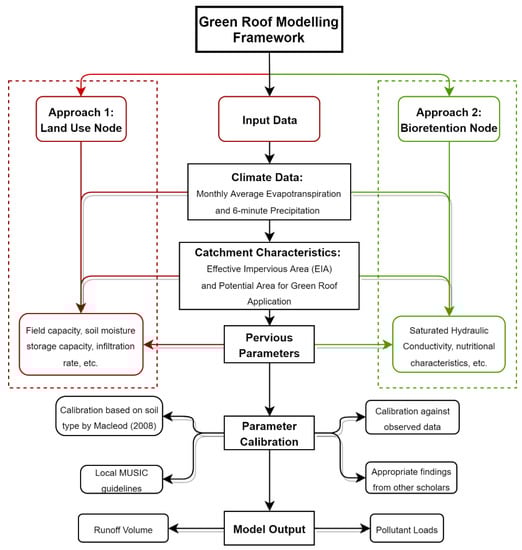 Green roofs (GR) are known as one of the most effective water-sensitive urban design (WSUD) strategies to deal with numerous environmental and social issues that urbanized cities face today. The overall quality of research on GRs has significantly improved and an increasing trend is observed in the amount of research over the last decade. Among several approaches, the application of modeling tools is observed to be an effective method to simulate and evaluate the performance of GRs. Given that studies on GRs at a catchment scale are limited, this paper aims to provide a simple but effective framework for estimating the catchment-scale impacts of GR on runoff quantity and quality. MUSICX, an Australian-developed software that possesses the advantages of a conceptual model, is chosen as the modeling tool in this study. While MUSICX has built-in meteorological templates for Australian regions, this tool also supports several climate input file formats for application by modelers in other parts of the world. This paper presents two different modeling approaches using the Land Use node and Bioretention node in MUSICX. The steps used for model calibration are also provided in this paper. The modeling results present the annual reductions in runoff volume, total suspended solid (TSS), total phosphate (TP), and total nitrogen (TN) load. The largest reductions of roughly 30% per year were observed in runoff volume and TN load. The annual runoff reduction rate reported in this study is close to that of other published results. Similar research outcomes quantifying the benefits of GRs play a major role in facilitating the widespread implementation of GRs due to the awareness of both positive and negative impacts of GRs. Future studies are recommended to concentrate on modeling the impacts of implementing GRs at a large scale (i.e., scales exceeding the single-building scale) to fill the research gaps and enhance the modeling accuracy.