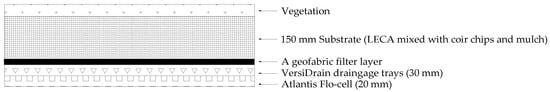 As indicated earlier, MUSICX with numerous improvements in the modeling algorithms when compared to the classic MUSIC version was chosen to be used in this study. There exist no obvious advantages of a model over another, and the accuracy of both conceptual and physical hydrological models must be assured by proper calibrations []. On the other hand, among existing GR plots at the VU campus, the chosen one has a 150 mm substrate; a mixed substrate of Light Expanded Clay Aggregate (LECA) (80%), mulch (15%), and coir chips (5%); a geofabric filter layer; and a drainage layer comprising VersiDrain drainage trays and Atlantis Flo-cell. Figure 4 illustrates a cross-section of the VU GR system used for modeling inputs. The VU GR is designed to be a lightweight system with innovative products. LECA is a lightweight material with a high capacity of water absorption. Atlantis Flo-cell is a light-weight product to provide structural support and water storage. The light-weight VersiDrain trays enhance the drainage layer by storing more than 11 L of water per square meter.