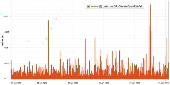 The 50-year rainfall and PET data from 1 January 1960 to 31 December 2010 were selected for the simulation. This period meets the requirements of Melbourne Water [] MUSIC guidelines in terms of data quality, data availability, and minimum data period. The 6 min rainfall data from BoM for the chosen period are shown in Figure 5. The following sections describe the calibration process of the model through a variety of guidelines and values reported by other scholars. The flow data and substrate hydraulic characteristics obtained from soil testing are missing in the present study and would be part of future work that would be undertaken to improve the model’s validity.