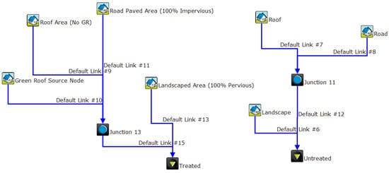 Figure 6 illustrates the MUSIC layout of green roof modeling based on the land use node. Due to the lack of a particular treatment node, two separate diagrams in the same model were created for the performance comparison. One including a source node representing the green roof has a receiving node called “Treated”. The other, describing different surface types at the VU campus catchment without green roof treatment, is finished with a receiving node called “Untreated”. The results from these two receiving nodes, “Treated” and “Untreated”, are presented in Figure 7. As expected, the “Treated” node completely outperformed the “Untreated” one. The presence of green roofs brings significant benefits, especially the reductions in flow volume and TN load of 29.29% and 28.23%, respectively.