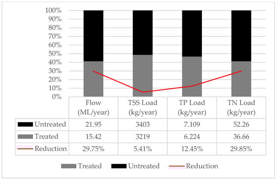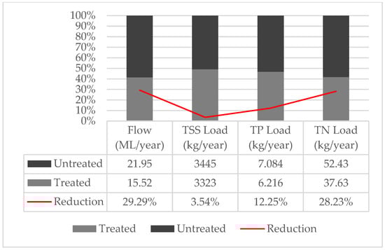 As presented earlier, the hydrological behavior of GRs was simulated using the land use and bioretention nodes in MUSICX. Figure 7 and Figure 9 show that there are negligible differences in outcome between these two approaches. This implies that they are likely to be used interchangeably to investigate the effects of large-scale implementation of GRs in MUSICX. The small impacts of GRs on the mitigation of TSS is worth mentioning. This could be because of the sediments primarily sourced from ground and road surfaces, whereas green roofs cover a small portion of the VU catchment. Additionally, the reductions in TSS, TP, and TN did not meet the stormwater quality management objectives as set out in the Environment Protection Authority (EPA) Victoria Guidelines (TSS: 80%, TP: 45%, and TN: 45%) []. The poor performance of VU’s large-scale GRs in terms of stormwater quality could be due to the insignificant area of GRs with only around 23% of the total catchment area of the VU’s campus. The large area of ground and hard surfaces greatly contributes to the sources of TSS, TP, and TN.