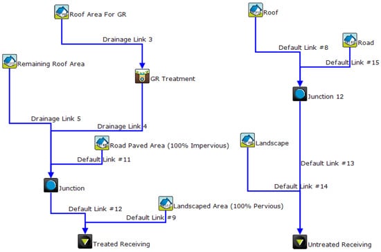 In general, GR and bioretention systems share a similar concept and design. They both have water surface storage, a planted soil layer, and a drainage layer []. They also provide huge benefits for stormwater absorption and filtration [,]. Bioretention has a thick substrate and a great detention depth with 0.1–0.15 m of topsoil layer above 1–1.25 m of engineered substrate layer []. Conversely, GR, especially EGR, has a nominal detention depth and a shallow substrate, which are only favorable for the growth of drought-tolerant plants. Though the bioretention node is the closest available treatment node to GR, this node requires extensive modifications to reflect the hydrological performance of a typical GR.