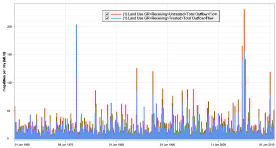 Irrigation is required to maintain the establishment and survival of GR vegetation. Therefore, it adds a considerable water volume to GR systems, resulting in more runoff and affecting GRs’ hydrological performance. The irrigation demand is thus reasonably involved in modeling. However, MUSIC does not have a specific function to simulate irrigation. Liebman, Wark and Mackay [] successfully included the irrigation demand by modifying the rainfall template in MUSIC and using an imported node. Regardless of the substantial impact of irrigation on green roof hydrological performance, it is impossible to include irrigation in large-scale modeling in this study due to limitations of the currently used MUSICX version. Future studies are suggested to add irrigation to the rainfall template applied to a model containing GRs only. The imported node containing outputs of the GR-only model will be consecutively inputted into the main model for the whole catchment with the unmodified rainfall template.