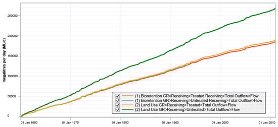 In addition to the requirements for improvements in stormwater quality, the EPA guidelines also recommend reductions in stormwater volumes []. These reductions vary by climate region and a reduction in stormwater volume of 29% through harvesting/evapotranspiration is recommended for VU’s Footscray Park Campus. It can be observed from Figure 7 and Figure 9 that the reduction in flow volumes using both the land use and bioretention nodes meet the EPA guideline requirements. Figure 10 illustrates a significant change in runoff volume before and after the application of GR on all existing buildings at the VU campus. The annual stormwater reduction is around 30% in both studied approaches in this paper. This is comparatively similar to other published results. For example, Versini, et al. [] reported an averaged runoff reduction of 25.2% using a coupled conceptual and SWMM model. Roehr and Kong [] reported 29% and 28% of runoff reduction per year with large-scale EGRs using low-water-use plants with an annual precipitation of 1200 mm and 1219 mm, respectively. A water-balance model was applied in this study. Runoff reduction from the application of EGRs throughout a Chinese city in Liu, et al. [] fluctuated from 27% to 42% in different rainfall events, which was simulated with SWMM. However, the study of Barnhart, et al. [] published a lower runoff reduction of only 10% to 15% and 20% to 25% yearly for EGR and IGR scenarios, respectively. Similar to runoff quality, runoff quantity (i.e., stormwater volume) could be further reduced by combining GRs with other WSUD strategies such as rainwater tanks and bioretention systems. Additionally, the results from [] and [] using MUSIC to model GRs are not comparable to this current study, since they were conducted at a building scale. Figure 11 further describes the difference between them in terms of cumulative flow volume. The difference in runoff quantity from the untreated scenarios can hardly be seen, whereas the runoff volume treated with the GR-bioretention node is slightly higher than that of the GR-land use node.