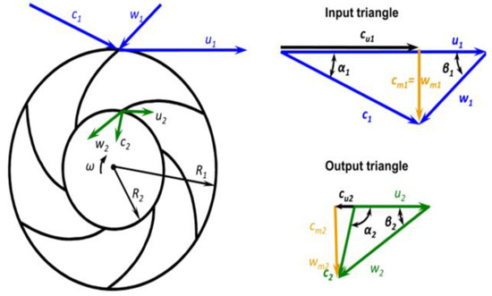 A combination of specific values for Q (m3/s), N (rpm) and H (m) determines the so-called “design point” or Best Efficiency Point (BEP) of the hydro-turbine, i.e., the point where the hydro-turbine is designed to operate at its highest efficiency. Euler’s fundamental equation for turbines relates the power absorbed from the water flow with the geometry and the velocities of the runner. Its general formulation is presented in Equation (2a). By rearranging Equation (2a) by means of introducing the geometrical properties of the runner, its mathematical formula shapes into Equation (2b). Equation (2b) applies to all reaction type turbines and becomes more accurate when blade thickness can be assumed negligible when compared with the annulus passage area over the entire blade zone [30]. The schematic representation of the velocity triangles at turbine inlet and outlet, along with the notation of the various velocity components and angles that are employed in Equation (2) are depicted in Figure 2.