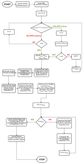 The algorithm is divided into two processes that interact with each other via the EPANET-MATLAB toolkit. The first is dedicated to the hydraulic design and performance prediction of hydro-turbines and is exclusively performed within the MATLAB environment. The second routine, which is performed within EPANET, integrates the turbine model within the WDS and launches the hydraulic simulation of the whole network. The interconnecting link between these procedures is the H–Q curves that are constructed in MATLAB and imported in EPANET, so that the turbine realistic operation via the GPV model is incorporated. The individual details and technicalities regarding each algorithmic process are displayed on the following flow charts (Figure 4 and Figure 5) and are extensively explained below.