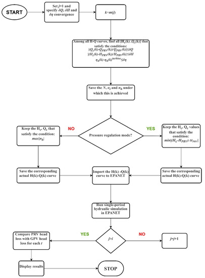 Initially, the turbine’s rotational speed and the pressure setting of all the PRVs that are scheduled to be replaced by turbines is requested. Then iteratively, for each time period t, the current PRV’s upstream pressure is compared with the pressure setting. If the upstream pressure is greater than the pressure setting then the PRV is active and the corresponding pipe flow along with the actual head drop (Hupstream − Hdownstream) is stored. At the same time, the total number of hours i and the exact set of hours within the day m(i) that the PRV is active are stored, before the algorithm proceeds to the next time period t. If the upstream pressure is less than or equal to the pressure setting, then the PRV, and successively the GPV/turbine, is considered as inactive. In this case, the algorithm skips the current time period t and advances to the next one (t + 1). When the final time period is reached (t = 24 h), the process continues with the calculation of the flow rate and head loss profile that is achieved during the PRV’s active periods and is later requested by the GPV/turbine operation. Next, according to the current pipe flow rate and PRV’s head loss range, the methodology explained in Section 2 is applied to determine the proper dimensioning and turbine working point. This eventually leads to the construction of the actual H–Q curve for the suggested design point. This H–Q curve is also constructed for different angle values α1, which are close to the design point value , by applying Equation (2b). By implementing the similarity laws around the design point, by means of Equations (7)–(11), the performance map of the hydro-turbine, i.e., H–Q and η–Q curves for different N and α1, are created. From these curves, only the non-negative Ho–Qo pair values are accepted (see “turbine region” in Figure 3). At this final step the process terminates, and its output is stored as a performance map and is ready to be imported to the EPANET environment.