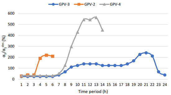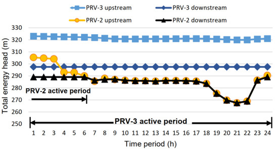 The exact working periods of the turbines are identical with the time periods that the PRVs are active, since they both aim at regulating pressure at a predetermined threshold.