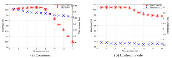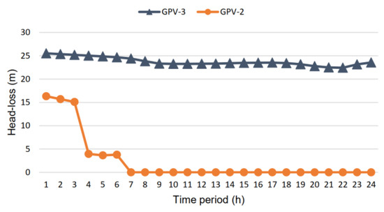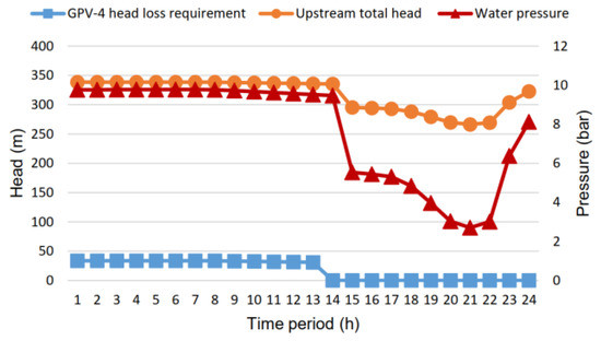 However, after the replacement of PRV with the GPV, the former PRV upstream and downstream nodes now correspond to turbine inlet and outlet, and since there is no elevation difference between them the elevation head is considered zero. Moreover, the acceptable range for water velocity in a typical WDS (0.2 m/s and 1.5 m/s) leads to insignificant kinetic head values, and thus it is practical to assume that the total energy head is identical with the pressure head. As a result, the head loss that needs to be imposed by the GPV for each active time period and results from the numerical subtraction of the upstream and downstream total energy head also corresponds to the precise pressure difference between turbine inlet and outlet, expressed in meters of head. Then the real pressure drop (bar) that is imposed by the turbine can be easily calculated, since 1 bar of pressure is approximately equal to 10.12 m of head.