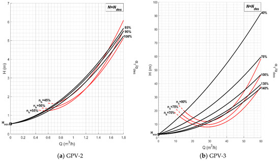 Since the first priority is to secure the requested head loss during all time periods, the turbine will be forced to operate under part load conditions corresponding to lower power output. In order to achieve the desired head loss at each time period with the available water flow, various H–Q characteristic curves with different rotational speeds (N) and Guide Vane Openings (GVOs) should be produced. A change in guide vane opening translates to different absolute flow angle at inlet (α1), which in turn affects the velocity triangle at turbine’s inlet, as it was shown in Figure 2.