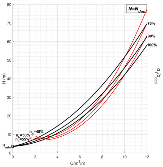This can be achieved by building the turbine’s ideal H–Q curve for the current design point, adjusting its shape by including the various losses, and then producing the final H–Q curve by applying the similarity law at each such curve (see Section 2.1 and Section 2.2). For each rotational speed there is a group of characteristic curves created by different angles α1, as Equation (2b) suggests. When the rotational speeds are too far from the design point, the corrective nature of Equation (12) should be employed. In this paper, without affecting the validity of the method, the rotational speed N2 that appears in Equations (7)–(12) is allowed to vary from 0.5Ndes to 2.5Ndes. The proper calculation of losses is described in Section 2.1. The previous methodology, by means of a concise algorithmic process that couples both turbine design (MATLAB) and turbine model simulation (EPANET), is summarized in the next section.