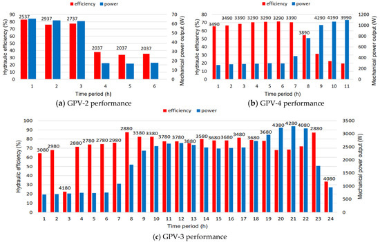 The efficiency of typical 4 pole electrical generators is calculated according to the IEC Standard for efficiency classes [56]. Since GPV-2 produces an average mechanical output power of 40 W, it is reasonable to assume an efficiency between 0.5 and 0.6 (IE3 class and above). Therefore, the daily electrical energy output will range between 0.12 and 0.144 kWh. Similarly, for GPV-3 and GPV-4 that produce an average mechanical output power of 2 kW and 777 W, respectively, the final efficiency will range between 0.85–0.9 and 0.82–0.85, thus leading to a total power output range between (40.8–43.2) kWh and (8.28–8.56) kWh, respectively.