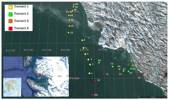 The Blomstrandbreen glacier is located in the northeastern area of the Kongsfjorden, an area affected both by freshwater inputs coming from the melting glacier and by Atlantic currents from the north []. Recently, water circulation within the Kongsfjorden has changed following the opening of a channel between the land, the glacier, and the Blomstrandhalvøya island.