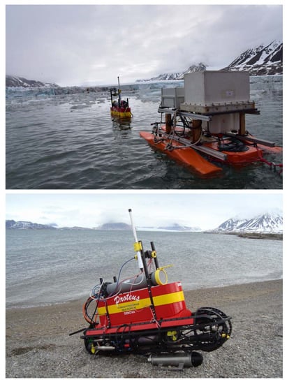 Recently, PROTEUS (Portable RObotic TEchnology for Unmanned Surveys), a marine robotic vehicle, was developed to collect atmospheric and sea-ice data in areas that are not safely accessible to humans, such as along glacier fronts [,]. The use of the PROTEUS allowed us to collect water samples from stations located in the Kongsfjorden close to the Blomstrandbreen glacier front, along four different transects.