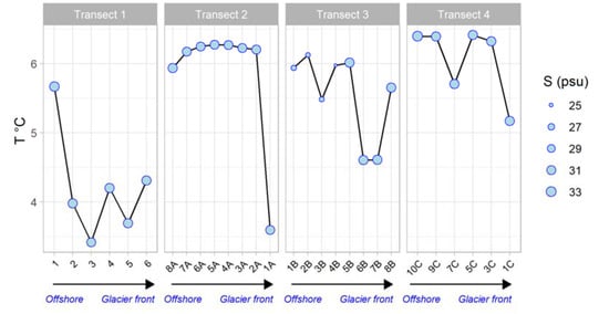 Trends of temperature and salinity values recorded across the four transects. In the x-axis, stations are ordered from offshore to glacier direction. The lines indicate the temperature variations, while the size of the dots indicates the variability recorded in the salinity values.