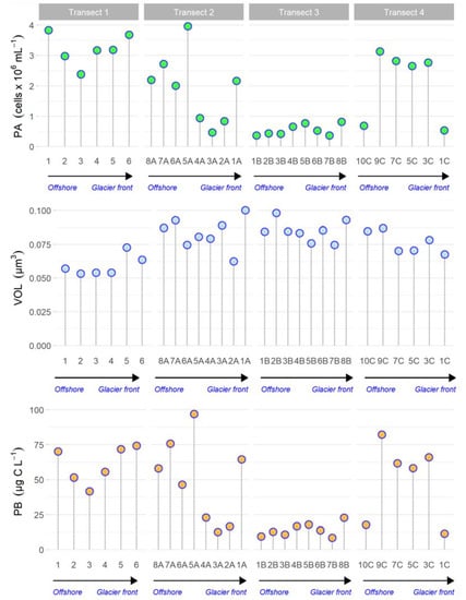 - Transect 2 was characterised by large-sized microorganisms, actively respiring cells and terrigenous inputs (i.e., Nanoeukaryotes, VOL, CTC, PO43−);
