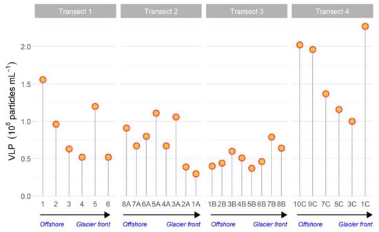 Spatial trends of virus-like particles across the transects were reported in Figure 5. The virus-like particle (VLP) abundance was in the order of 105–106 VLP mL−1. The highest counts were observed along Transect 4 (mean value 1.6 ± 0.5 × 106 VLP mL−1), while the smallest one was in Transect 3 (0.53 ± 0.14 × 106 VLP mL−1). From the examination of the various stations in Transects 1, 2, 3 and 4, a clear variability was observed (CV = 47, 40, 27 and 32%, respectively). Four different viral sub-populations (namely V1, V2, V3 and V4) were distinguished based on their fluorescence signals, virus sub-population with the lowest green fluorescence being named V1 and the highest V4 (Figure 6). In all samples, the V1 group (mainly bacteriophages) accounted for 75% of the total VLP; a lower percentage was determined for the V2 group (17%), while V3 and V5 groups were negligible (5 and 2%, respectively). Virus to prokaryotic abundances ratios (VPR) ranged from 0.16 to 1.14 at different sampling points with similar average values among the Transects 1 (VPR = 0.38), 2 (VPR = 0.36) and 3 (VPR = 0.32). However, the average ratio VPR at Transect 4 (VPR = 0.88) showed significantly higher viral activity compared to the other transects.