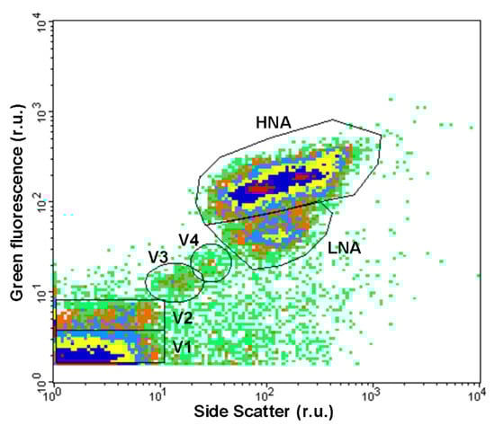 - Gasol, J.M.; del Giorgio, P.A. Using flow cytometry for counting natural planktonic bacteria and understanding the structure of planktonic bacterial communities. Sci. Mar. 2000, 64, 197–224. [Google Scholar] [CrossRef]
