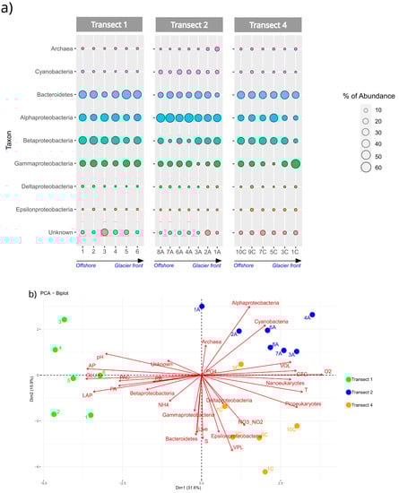 A higher percentage of Proteobacteria (mainly Alpha-, Beta- and Gammaproteobacteria) was retrieved at offshore stations, with a decrease when approaching the glacier. Exceptions were stations 1A and 1C, which, despite being closest to the ice front, showed an overall proteobacterial abundance of 87.6 and 66%, respectively. Conversely, Bacteroidetes showed higher abundance values at the stations nearest to the glacier (e.g., stations 5, 3A, 2A and 3C with 40.0, 31.7, 23.8 and 42.0%, respectively). Also, in this case, stations 1A and 1C, compared to the rest of the transect, showed a different trend with an abundance of 7 and 27.1%, respectively. Cyanobacteria were found mainly along Transect 2, with their highest abundance at station 6A (9.1%). Finally, the abundance of Archaea was generally low and with comparable values (minimum value 0.1% at station 7A, maximum value 0.7% at station 9C) at all stations. Exceptions were stations 1A and 2A (the closest to the glacier in Transect 2), which showed abundances of 6.9 and 1.8% of Archaea, respectively.