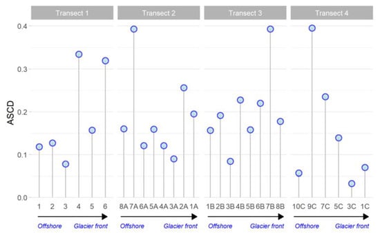In Figure 3, the behaviour of T/S diagrams across the four transects is shown. High variability was observed for T, with minimum values at Transect 1 and maximum values at Transect 4. T ranged from 3.4 to 5.7 °C (Transect 1), from 3.6 to 6.3 °C (Transect 2), from 4.6 to 6.1 °C (Transect 3) and from 5.2 to 6.4 °C (Transect 4). Within the transects, temperature variability was also observed, with minima at stations 3 and 5, 1A, 6B and 7B, 7C and 1C, with most of them corresponding to near or at the glacier front. Spatial variability was significant, as determined by ANOVA, between Transect 1 and 4 (df = 2; F = 34.8; p = 1.66 × 10−9).