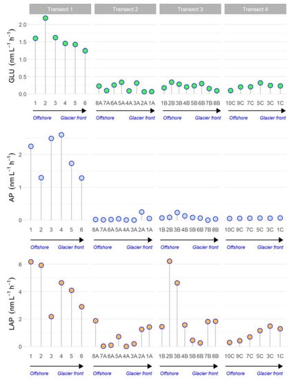 In all the transects, LAP prevailed compared to GLU and AP with average values of 1.928 ± 1.954, 0.496 ± 0.602 and 0.465 ± 0.826 nmol L−1 h−1 for LAP, GLU and AP, respectively (Figure 9). Spatial variability in the microbial metabolism was significant, as shown by ANOVA (F = 9.13, p = 1.67 × 10−3; 120.94, 1.56 × 10−11; 80.92, 5.05 × 10−10, for LAP, GLU, AP, respectively). At Transect 1, all the enzyme activities reached their peak values, with an average of 6.185 ± 1.603, 1.600 ± 0.322, and 2.249 ± 0.586 nmol L−1 h−1 for LAP, GLU and AP, respectively. For LAP and GLU, the highest activity rates were recorded at stations 1 and 2 (on the southern side of the transect), while for AP at stations 3 and 4 (in the middle of the transect), decreasing trends towards the glacier were observed. Along Transect 1, a minimum of LAP activity was recorded at station 3, in correspondence with a minimum of T. Transect 2 was characterised by the lowest enzyme activity levels, showing LAP, GLU and AP average values of 0.702 ± 0.730, 0.183 ± 0.115, and 0.049 ± 0.084 nmol L−1 h−1, respectively; similar average values were recorded at Transect 4. Spatially, LAP and AP were more active at coastal stations 1A and 2A and decreased along the transect; GLU followed an opposite pattern, with increased activity toward offshore stations. At Transect 3, microbial metabolism showed intermediate values between Transect 1 and Transects 2 and 4, with proteolytic and phosphatasic activity values about 3 and 2 times higher than those measured at Transect 2, respectively. High LAP and GLU activities were found at stations 2B and 3B, while AP peaked at station 3B in the middle of the transect. At transect 4, enzymatic values were similar to those measured at Transect 2.