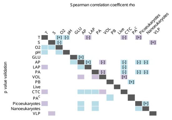 Spearman correlation coefficients are shown in Figure 10. From the analysis, it was possible to highlight a strong negative correlation between the respiring cells, pico and nanoeukaryotes and enzymatic activities. Pico- and nanoeukaryotes are also strongly positively correlated among them. In relation to the physical and chemical parameters, respiring cells and Picoeukaryotes were negatively and positively related to the temperature, respectively, and there was a positive correlation between viral particles and salinity.
