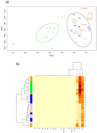 nMDS and Cluster analyses. (a) nMDS analysis, the stress was minimised after some number of reconfigurations of the points in 2 dimensions. The nMDS ordinations shown here were generated with k = 2 (linear fit r 2 = 0.921; non-metric fit r 2 = 0.982), and ellipses in the figure represent 80% of confidence between samples. (b) heatmap underlining how the investigated parameters varied across all analysed transects, their relation, and how the samples were grouped together.