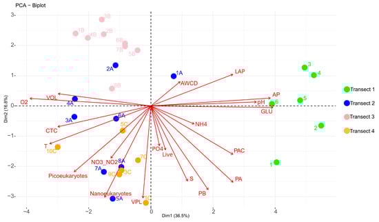 The PCA was made on the normalised data matrix to determine the weight of the parameters in the distribution of the sampling stations based on the variance calculation. The PCA (Figure 12) reconfirmed the above-reported results, highlighting the separation of Transect 2 from the others. Furthermore, stations 1A and 2A grouped together with Transect 2. In general, the total variance of the analysis was higher than 50% (53.3%), being distributed in Dim1 = 36.5% and Dim2 = 16.8%, respectively. Enzymatic activity, carbon source utilisation (ASCD) and pH were three distinctive parameters in quadrant I, whereas O2 and VOL determined the sample distributions in quadrant II. The third quadrant distribution was instead guided by both T and biological parameters (CTC, Nanoeukaryotes, Picoeukaryotes and VPL). Finally, in quadrant VI, most of the influences came from nutrients (PO43− and NH4+), PA and S. The analysis first underlined the complete separation of transect 1 from the others, guided by pH and enzymatic activities. The stations belonging to Transects 2 and 4 were distributed over the II and the III quadrants, with a partial overlap; the 1C station was distinct from the remaining Transect 4 stations, which followed the behaviour of viral abundances. In the same way, station 1A also stands out by following the trend of the ASCD parameter. The PCA also highlighted the separation of the stations belonging to Transect 3, which were largely influenced by VOL and O2 parameters.