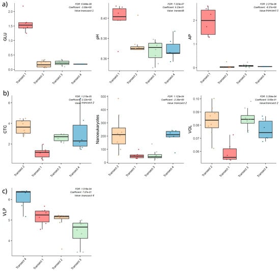 The results of the nMDS analysis (Figure 11a) highlighted how the sampling stations belonging to Transect 1 were totally separated from those of the other transects, and samples 1C and 10C clustered together in a separate group. Conversely, Transects 2, 3 and 4 showed a more homogeneous trend. From this figure, it is evident that the enzymatic activities (GLU, AP, and LAP) were the parameters responsible for the separation of Transect 1 from the others. In the same way, the nanoeukaryotes’ distribution seemed to guide the cluster formed by 1C and 10C samples.