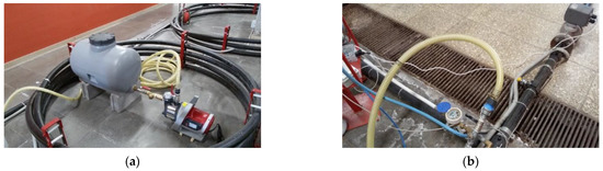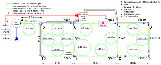 The experimental network of Enna University (UKE) is a closed water distribution network composed of high-density polyethene pipes (HDPE 100) with a nominal pressure of 16 bar (PN16), a DN (nominal diameter) of 63 mm, and a thickness of 5.8 mm. The net is divided into three meshes, each of which contains pipe windings with a radius of 2.0 m and a length of approximately 45 m. Eight “users” are connected to the leading network through eight internal nodes consisting of multilayer polyethene pipes with diameters of 20 mm (internal diameter of 12.7 mm), which simulate the domestic users of a virtual network (Figure 1 and Figure 2).