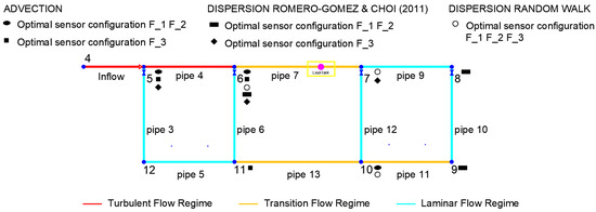 Urban looped water distribution systems are highly vulnerable to water quality issues. They could be subject to contamination events (accidental or deliberate), compromising the water quality inside them and causing damage to the users’ health. An efficient monitoring system must be developed to prevent this, supported by a suitable model for assessing water quality. Currently, several studies use advective–reactive models to analyse water quality, neglecting diffusive transport, which is claimed to be irrelevant in turbulent flows. Although this may be true in simple systems, such as linear transport pipes, the presence of laminar flows in looped systems may be significant, especially at night and in the peripheral parts of the network. In this paper, a numerical optimisation approach has been compared with the results of an experimental campaign using three different numerical models as inputs (EPANET advective model, the AZRED model in which diffusion–dispersion equations have been implemented, and a new diffusive–dispersive model in dynamic conditions using the random walk method, EPANET-DD). The optimisation problem was formulated using the Monte Carlo method. The results demonstrated a significant difference in sensor placement based on the numerical model.