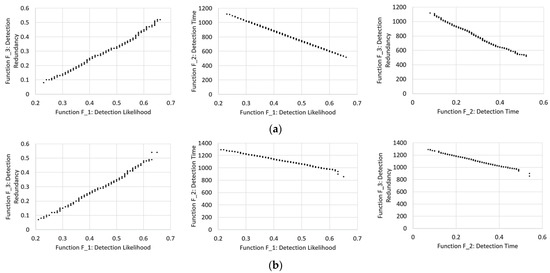 Using the AZRED formulations, the optimal solutions considering dispersion differ from the advective case by considering both the optimal sensor location and the objective function values (Table 1). As in the previous case, the objective functions F_1 and F_2 were maximised by the exact configuration of sensors (6–8–9), with values slightly lower than the previous values. As a result, the contamination event had a detection likelihood of 65%, and the optimal value of the detection time was somewhat more than 14 min. For the objective function F_3, the optimal redundancy value of 54% was obtained from a different configuration than the first method and included nodes 5–6–7. This is related to the importance of backward diffusive propagation, which is most evident in the laminar velocity profiles. Using the dispersive model, in which the dispersion was turbulent or transitional rather than laminar, the backwards diffusive propagation was less noticeable, as the dispersive behaviour was homogeneous across all network pipelines. Therefore, in this case, the discriminant that determines the redundancy phenomenon is a function of higher circulating water volumes (Figure 4). The Pareto fronts are presented in Figure 5b.