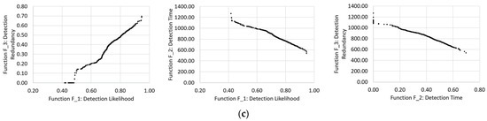The Pareto front, including only advection (row (a)), dispersion (AZRED by Romero-Gomez and Choi 2011, row (b)), and dispersion (EPANET-DD) (row (c)): F_1–F_3 (left), F_1–F_2 (centre), and F_2–F_3 (right).
