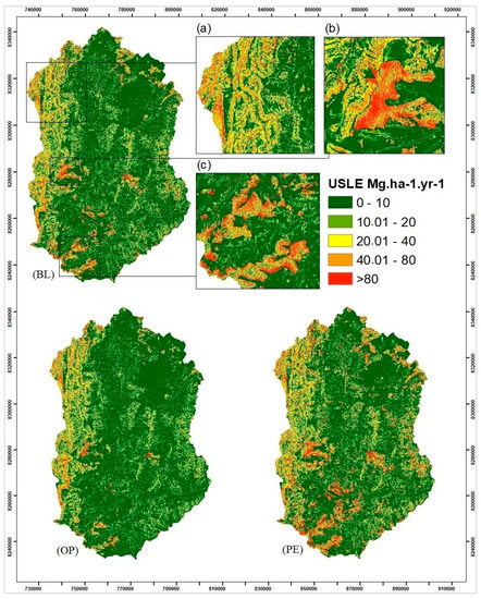 Basin soil loss (USLE) for the BL (baseline land use), the OP (optimistic land use), and the PE (pessimistic land use) scenarios, simulated with mean annual erosivity (baseline climate—Rm). The highlights of BL high erosion: (a) rugged slope, (b) eucalyptus plantation, and (c) eucalyptus plantations over highly erodible soils (Leptsols).