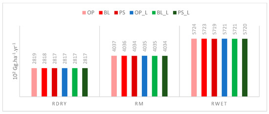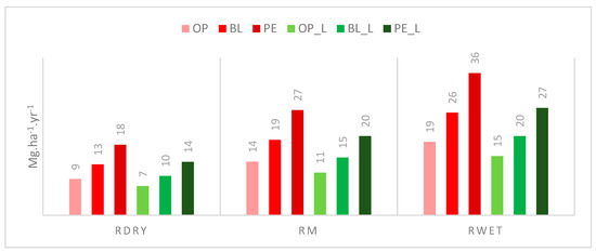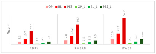 The annual basin sediment yield at the basin outlet varied from 0.2 to 0.3% and from 0.05 to 0.07% of the total soil loss generated inside the basin in the different LULC and conservation scenarios, respectively (Figure 7). The sediment yield ranged from 1.2 Gg yr−1 for the OP_L scenario (Rdry) to 52.2 Gg yr−1 for the PE scenario (Rwet).