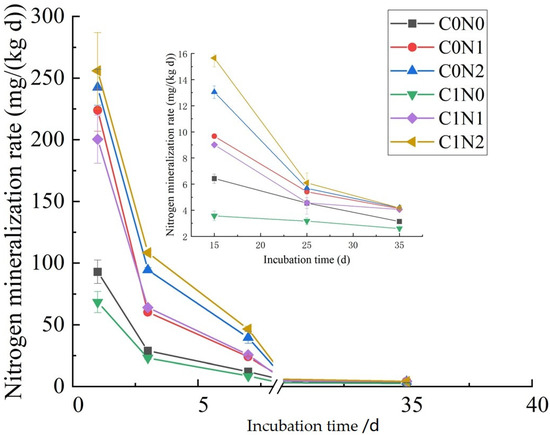 Under the conditions of returning straw to the field, the nitrogen mineralization rate of the saline soil in each treatment decreased gradually and became stable with the extension of the incubation time. The nitrogen mineralization rate of the saline soil in each treatment was C1N2 > C1N1 > C1N0. Within Days 0–7, the mineralization rate decreased rapidly, and the mineralization rates of C1N0, C1N1 and C1N2 decreased by 87.46%, 87.20% and 81.83%, respectively. The reductions in the rates of C1N1 and C1N2 were very similar. In the process of cultivation, returning straw inhibited the mineralization of nitrogen in saline soil under the reduced nitrogen and no-nitrogen fertilizer treatments and promoted nitrogen mineralization in the saline soil under the high-nitrogen treatment.