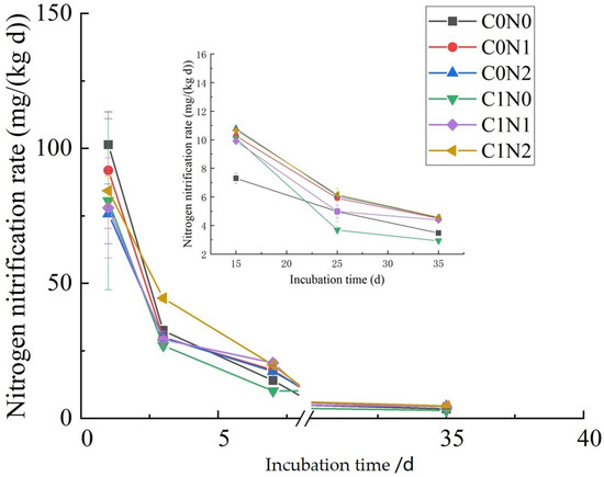 In this study, the order of the mineralization rate was C0N2 > C0N1 > C0N1. When straw was not returned to the field, the nitrogen mineralization rate in saline soil decreased rapidly over Days 0–7, and the mineralization rates of C0N0, C0N1 and C0N2 decreased by 86.91%, 89.26% and 83.64%, respectively. Moreover, the mineralization rate of C0N1 decreased the fastest. The amount of nitrogen fertilizer promoted the mineralization rate of soil nitrogen within a certain range, but excessive amounts of nitrogen fertilizer inhibited the mineralization of nitrogen in the initial stage of cultivation (0–3 d), which was consistent with previous research results on non-saline soil. Soil nitrification is an important step in providing nitrogen for plant growth. The application of nitrogen fertilizers to the soil significantly increases the amount and activity of nitrifying bacteria and enhances the nitrification rate of soil [10]. The nitrification rate without nitrogen fertilizer was the highest at the initial stage (0–3 d), but there was no significant difference in the nitrification rate among the different nitrogen application rates. The nitrification rate of C0N1 was the highest when cultured for 1 week, and there was a significant difference between the nitrification rate of C0N1 and that of the no-fertilizer treatment. From Day 15 until the end of the incubation period, the nitrification rate of C0N2 was high, and the nitrification rates of N1 and N2 had no significant difference only on Day 35, whereas the nitrification rates of soil nitrogen at other time points had significant differences. The amount of nitrogen applied at the initial stage of culture (0–3 d) promoted nitrification, but an excessive amount of nitrogen had no significant effect on nitrification.