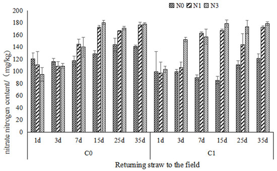 Under the conditions of returning straw to the field, the soil nitrate nitrogen content of each nitrogen application treatment increased slowly with the extension of the incubation time and reached the peak value on Day 15 of incubation. The order of the nitrate nitrogen content of saline soil with the application of nitrogen and returning straw was C1N0 < C1N1 < C1N2 (except on the seventh day of cultivation). For Days 0–3 of the culture experiment, returning straw significantly reduced the nitrate nitrogen content.