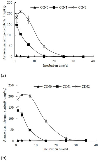 When straw was returned to the field, the content of ammonium nitrogen in the saline soil under the C1N0 treatment without the application of nitrogen was 13.79 mg/kg on Day 0 of the incubation, which continued to decrease with the incubation time until it reached 2.20 mg/kg on Day 35. The content of ammonium nitrogen in the saline soil under each nitrogen application treatment was significantly higher than that under the C1N0 treatment without the application of nitrogen. The content of ammonium nitrogen in the saline soil was significantly higher than that under the no-nitrogen treatment. During the whole incubation period, the content of ammonium nitrogen in the C1N1 soil decreased significantly with an increase in the incubation time, whereas that under the C1N2 treatment increased first and then decreased during the incubation period. Similar to soil without the return of straw, the order of the ammonium nitrogen content under each nitrogen application treatment in saline soil was C1N0 < C1N1 < C1N2. After the culture, the ammonium nitrogen content of each nitrogen application treatment was 2.20, 2.30 and 0.43 mg kg−1, respectively, and there was no significant difference among the three treatments. Similar to the situation with no return of straw, the order of ammonium nitrogen in the saline soil under the different nitrogen application treatments was C1N0 < C1N1 < C1N2. After the culture, the content of ammonium nitrogen in the soil under the different nitrogen application treatments was 2.20, 2.30 and 0.43 mg/kg, respectively. There was no significant difference among the three treatments.