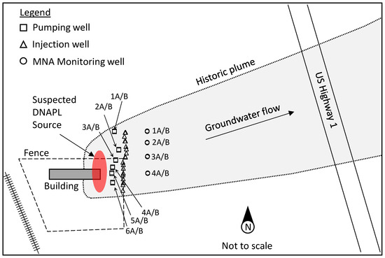 Multiple spill events occurred between 1964 and 1977 while TCE was used at the site. In addition to smaller, routine spills, two larger spills contributed to the contamination of the underlying aquifer. In 1966, two 55-gallon drums spilled, and in 1977, a hose burst [59]. A DNAPL source below the facility building (Figure 1) created a plume of TCE and its degradation products (cis-1,2-dichloroethene [cDCE], trans-1,2-dichloroethene, and vinyl chloride [VC]) which extended ~800 m downgradient. As of November 2021, cDCE and VC were the dominant contaminants above target cleanup levels across most of the site, while TCE exceeded target cleanup levels in only a few locations.