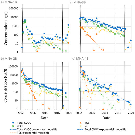 Concentration–time series for monitoring wells (a) MNA-1B, (b) MNA-2B, (c) MNA-3B, and (d) MNA-4B at the PFC site in Cocoa, Florida. Model fits are shown for select data only. The power law model fit for total CVOC in panel (b) is based on an exponent of 2. The vertical dashed lines indicate the following events from left to right: start of the PAT system in 2002, first biotreatment injection in 2015, and second biotreatment injection in 2019. Data shown in the graphs were taken from Geosyntec [63].