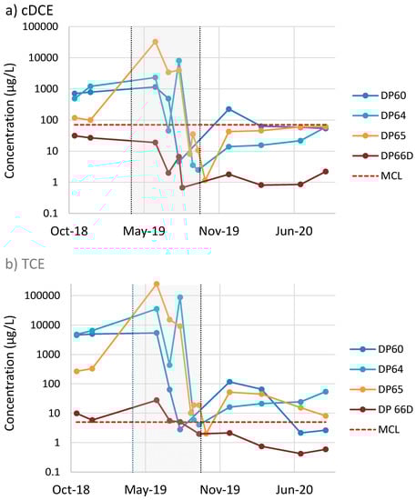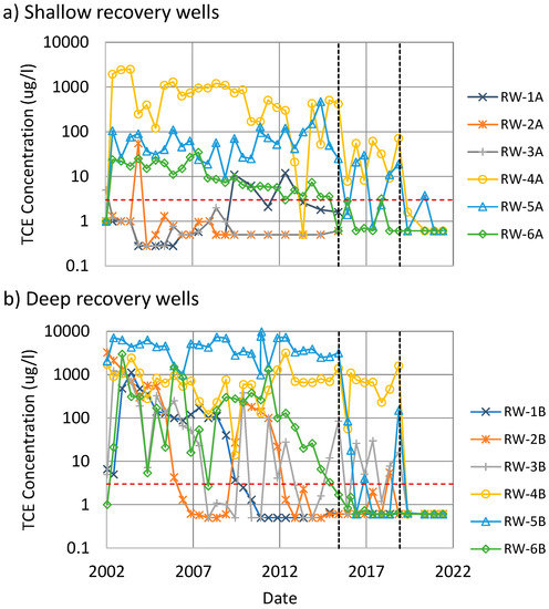 Concentration–time series for TCE from (a) shallow and (b) deep recovery wells used to hydraulically isolate the primary source zone. The vertical dashed lines indicate the first biotreatment injection in 2015 and second biotreatment injection in 2019. The red horizontal dashed line indicates the TCE remediation goal. Data shown in the graphs were taken from Geosyntec [63].
