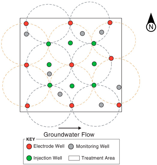 Well layout in the 12 m by 12 m EK treatment area with electrodes (red circles), amendment injection well (green circles), and monitoring wells (gray circles). The electric fields during Stages 1 and 2 are conceptually represented by the blue dashed lines and orange dashed lines, respectively. Adapted from Cox et al. [64].
