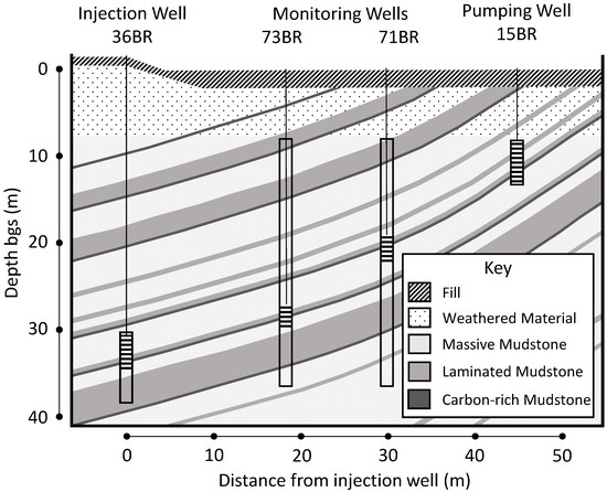 Cross section showing primary flow path from injection well 36BR to pumping well 15BR as indicated by the packer-isolated sampling intervals (horizontal line pattern). Adapted from Bradley et al. [96]. Geologic descriptions and primary flow path as noted by Révész et al. [68].