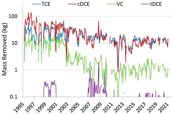 Lacombe [66] summarized the mass of CVOC removed by PAT at the site between 1996 and 2010. This data set was augmented with data ranging from 2011 to 2021 (Figure 6). During the first ~7 years of PAT operation (1995 to 2002), cDCE was the dominant CVOC in the combined treatment system influent, while later, cDCE was slightly below TCE (Figure 6). Overall, the rate of mass removal has been trending downward since the PAT system went into operation in 1995, as expected for a maturing system. However, since approximately 2015, the mass of recovered TCE and cDCE hovers around 10 kg per month, while the rate of VC removal is about one order of magnitude lower.