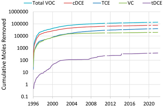 Cumulative moles of individual and total CVOC removed from NAWC by PAT from 1996 to 2021. Data from 1995 to 2010 were taken from Lacombe [66], data from 2011 to 2020 were provided by the U.S. Navy, and later data from 2020 to 2021 were taken from U.S. EPA’s monthly summary reports.